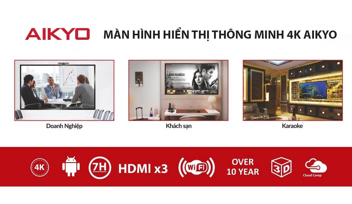 Màn mình hiển thị thông minh 4K Aikyo có thể đặt ở cửa ra vào, quầy lễ tân để trình chiếu những thông điệp ấn tượng, giới thiệu về sản phẩm, quy mô hoạt động mang đến cho khách hàng có một cái nhìn thiện cảm hơn trong sự uy tín hoặc có thể trang bị ở các phòng để khách hàng có thể xem phim, nghe nhạc, giải trí…